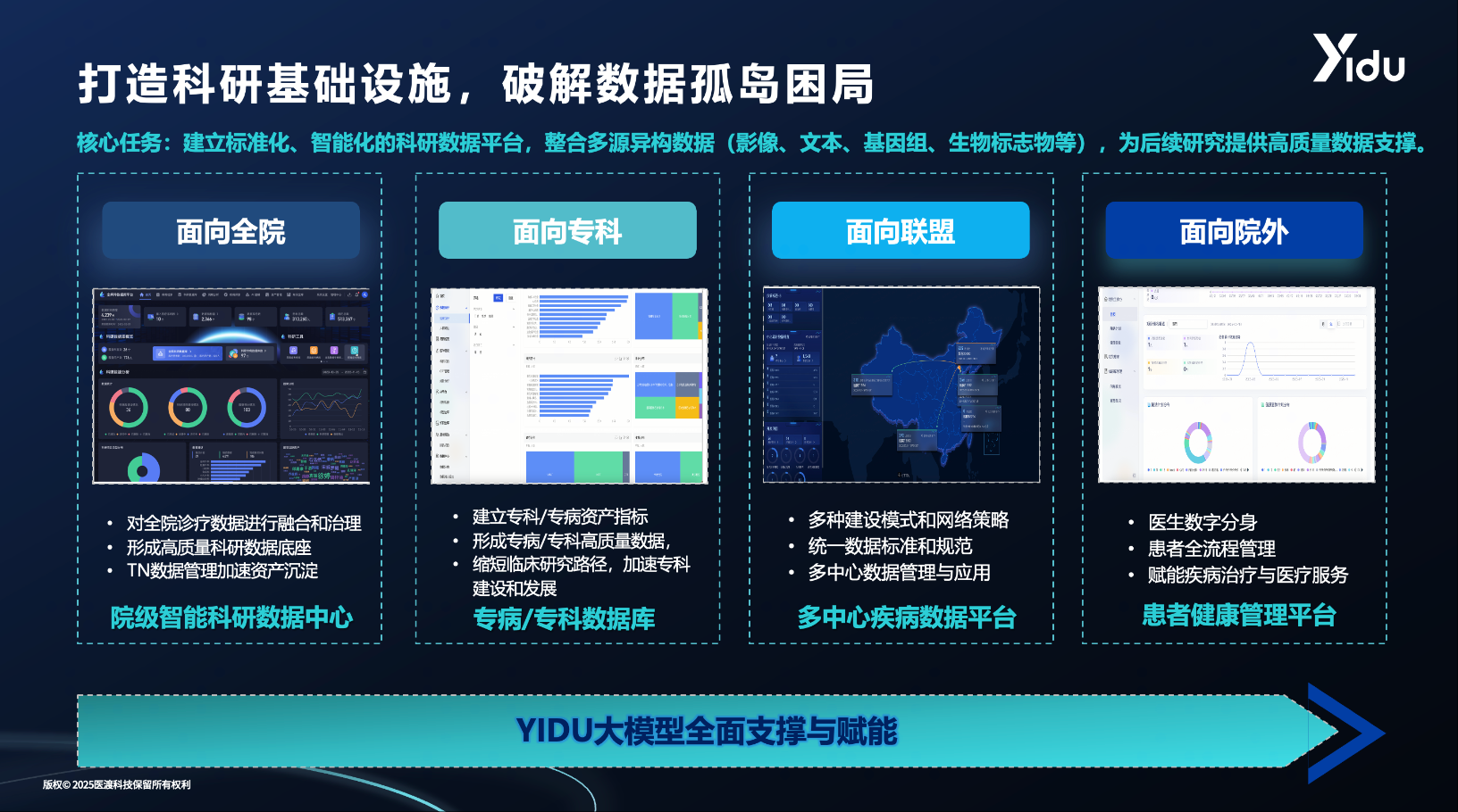 醫(yī)渡科技的科研創(chuàng)新不僅在于技術(shù)突破,更在于構(gòu)建了覆蓋“全院-專科-聯(lián)盟-院外”的智能科研生態(tài)體系。該體系從全院級數(shù)據(jù)中心到專科定制研究路徑,從多中心協(xié)同到臨床轉(zhuǎn)化延伸,在保障數(shù)據(jù)規(guī)范與安全的同時(shí),靈活滿足多元需求,大幅提升科研效率與質(zhì)量。