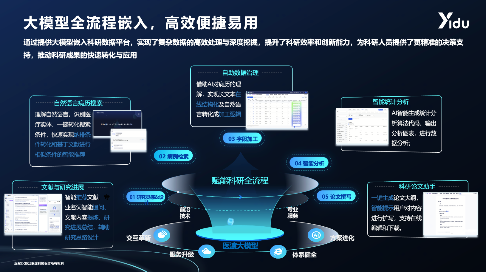 在科研大數(shù)據(jù)平臺能力升級中,醫(yī)渡科技自主研發(fā)的“醫(yī)渡大模型”已深度賦能科研全鏈條,推動科研全流程自動化,在自然語言檢索病例、智能數(shù)據(jù)加工、統(tǒng)計(jì)分析、論文撰寫等多個(gè)關(guān)鍵環(huán)節(jié)為研究者提供助力。